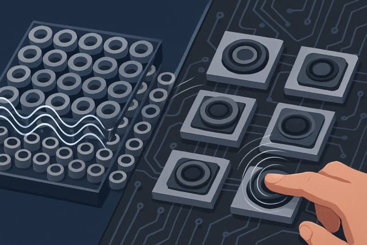 This new active acoustic metamaterial class is made from dual-state unit cells made from off-the-shelf electromagnetic linear resonant actuators (LRAs), which are found in many smartphones and gaming consoles. It has been found that a 1D array of LRAs can be used to create a self-tuned metamaterial with deep subwavelength bandgaps within touch-relevant frequencies. The dual unit cells act as resonators when they are left disconnected and act as vibration sources when powered. One of the key advantages is that it can be used with easy-to-access components, making it simpler to create for haptics designers.