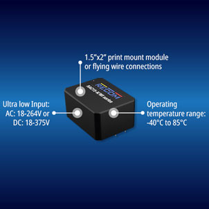 RECOM has pushed the boundaries of AC/DC performance with a miniature 15W part that operates over an astonishingly wide input range of 18-264VAC or 18-375VDC. The board-mount RAC15