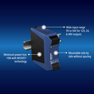 RECOM’s RACPRO1-RD40 is a new cost-effective DIN rail redundancy module, comprising a pair of MOSFETs and their control, configured as high-efficiency gating diodes. This enables R