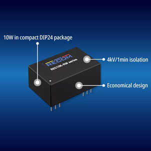The REC10K-RW series of encapsulated DC-DC converters, recently released by RECOM, features a wide 4:1 input range (9-36V and 18-75V DC) and a selection of regulated single and dua