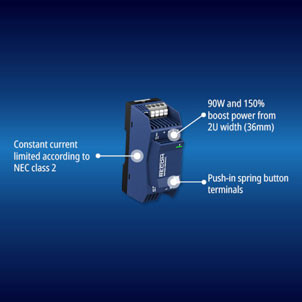 RECOM’s new, cost-effective REFIN2U-S90/24/CL DIN-rail AC/DC delivers a 90W rating with a boost capability of 150% for 4.5s to allow for surge loads. Input voltage range is 85-276V