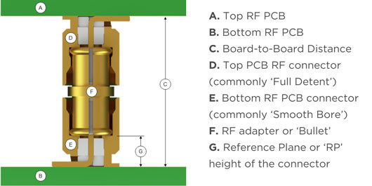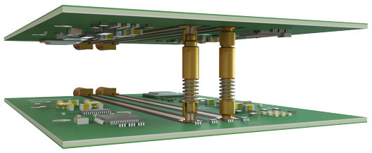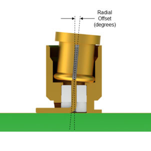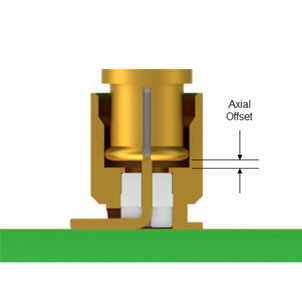 This connection transfers the signal between PCBs while sacrificing a minimum amount of RF power and getting the best VSWR/Return and Insertion Loss possible. To achieve this, radial and axial misalignment must be kept within tolerance.
