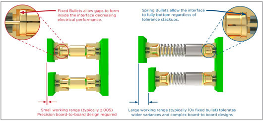 Fixed and spring bullets can be useful in applications where multiple board-to-board interconnects must mate simultaneously. However, for the bullet to mate successfully without crashing, the loose end of the bullet must be within the acceptable tolerance range.
