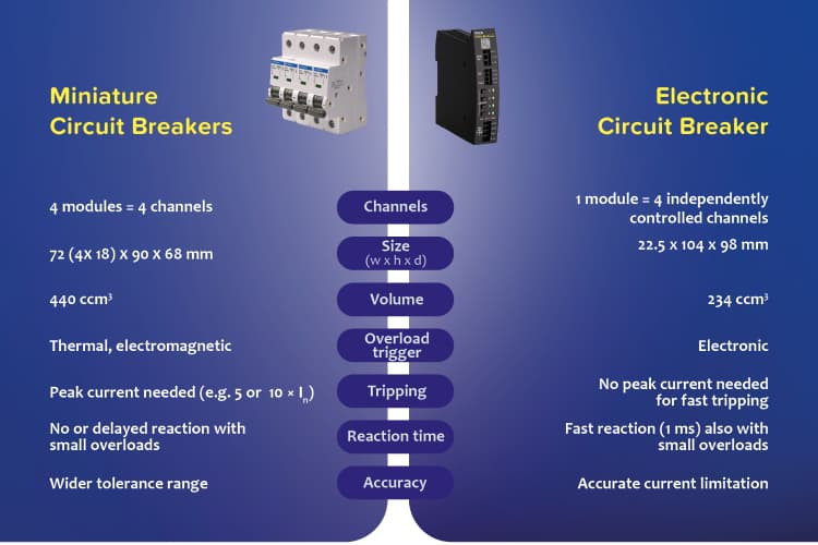 The table below summarizes the key differences between miniature circuit breakers (MCBs) and electronic circuit breakers (ECBs) to help you evaluate which protection method better suits your application.