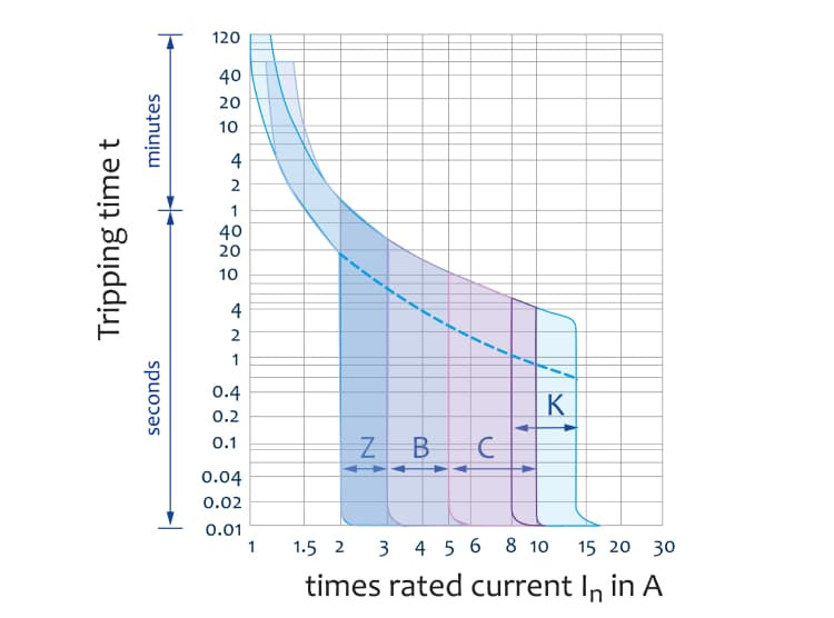 MCB: Tripping curves for B, C, Z and K characteristics
