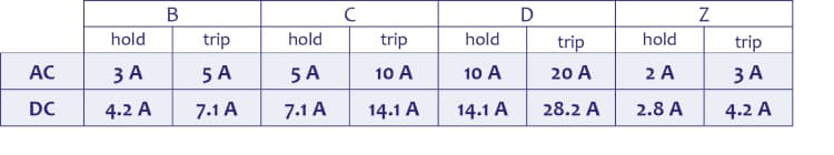 The tripping current of MCBs is always specified as AC in the datasheet and must be multiplied by 1.41 to convert to DC values; this graphic shows the AC current and the corrected DC current.